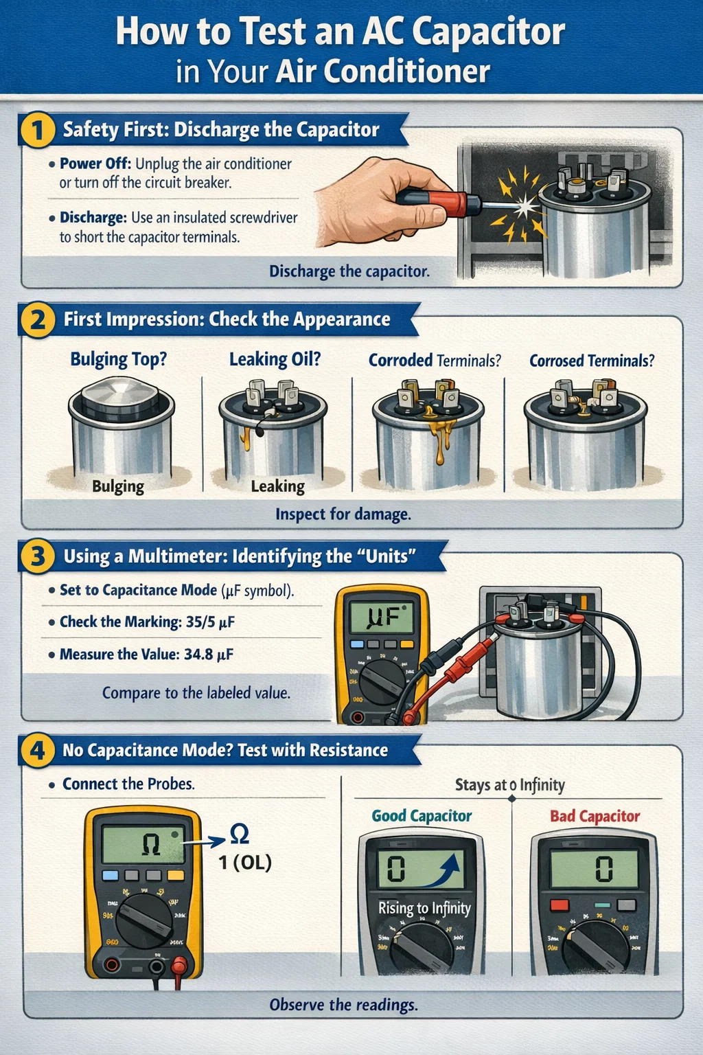 Annak megállapításához, hogy egy légkondicionáló kondenzátora jó vagy rossz, nem igényel professzionális elektronikai mérnöki ismereteket. Mindaddig, amíg rendelkezik egy „kapacitásteszt” funkcióval rendelkező multiméterrel, követheti ezeket a lépéseket, és maga is félig szakértővé válhat.