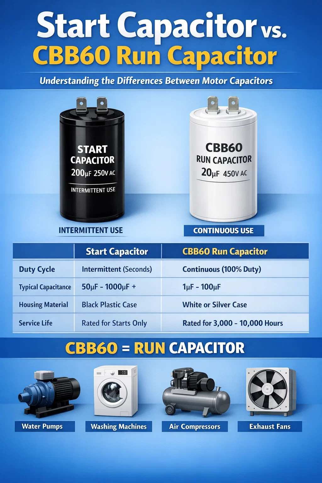 Funkcionális különbségek: Indítsa el a kondenzátort a CBB60 futási kondenzátorral szemben
